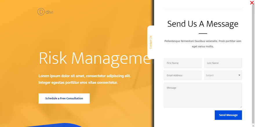 單擊標籤打開幻燈片,它顯示在屏幕上,顯示風險管理佈局包中的聯繫表格。 再次單擊“聯繫我們”按鈕將關閉幻燈片。 我將滑入寬度設置為 500 像素,標籤高度為 150,標籤寬度為 60。