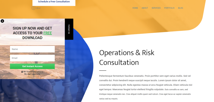 這是帶有退出意圖的收集電子郵件。 它包括幾個文本模塊、一個聯繫表單和一個圖像模塊。