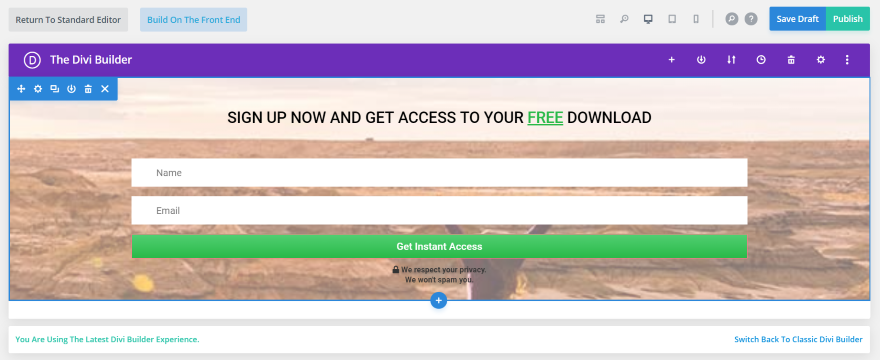 這是具有滾動意圖的收集電子郵件。 它包括一個背景圖像、兩個文本模塊和一個電子郵件模塊。