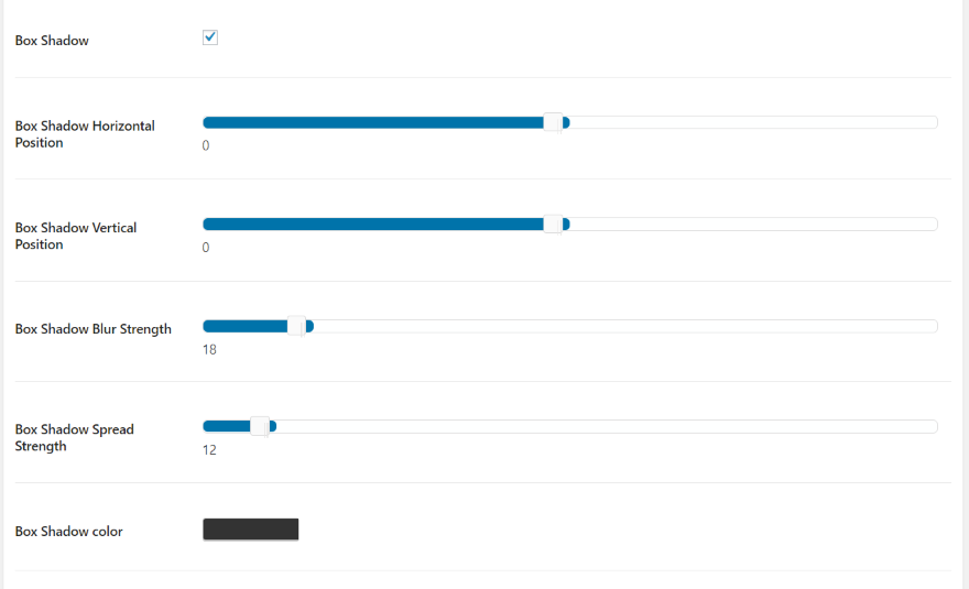 其他功能的添加或刪除取決於您選擇的選項。 我選擇了 Box Shadow,它現在提供了水平和垂直位置、模糊和擴散強度以及顏色的選項。