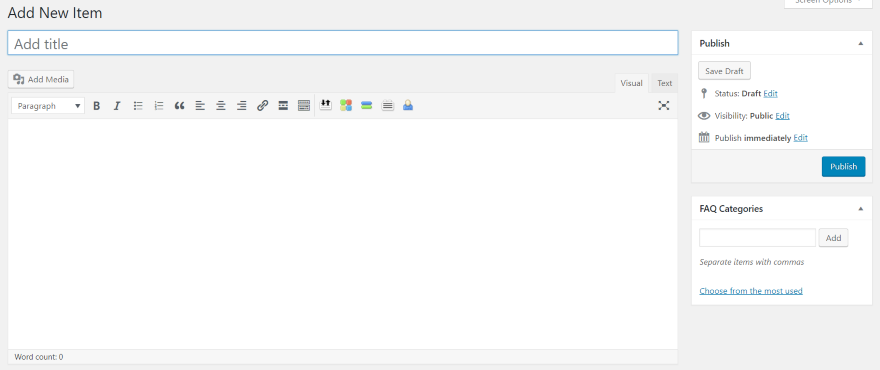 常見問題解答是使用經典風格的編輯器創建的。 您將在此處添加標題、內容、類別並發布常見問題解答。 由於它使用經典編輯器,您可以使用任何類型的內容,包括文本、媒體、HTML 等。您還可以在此處創建類別。