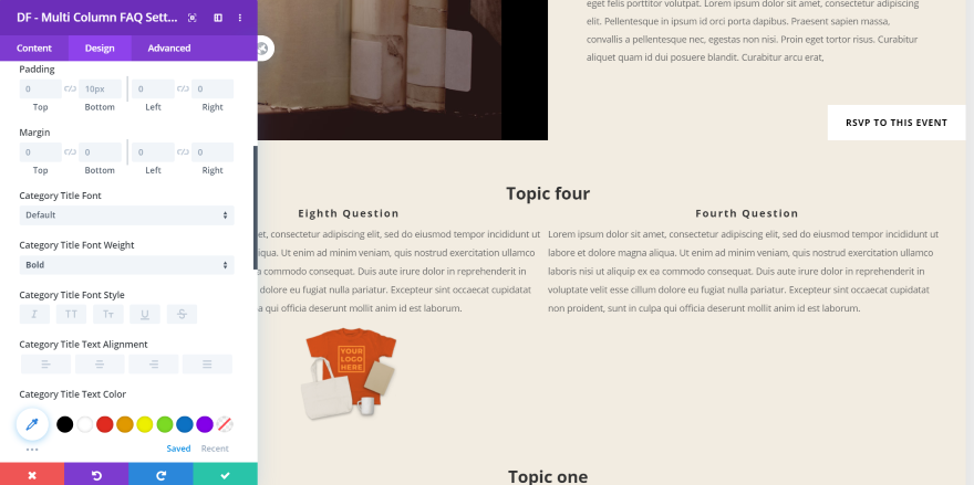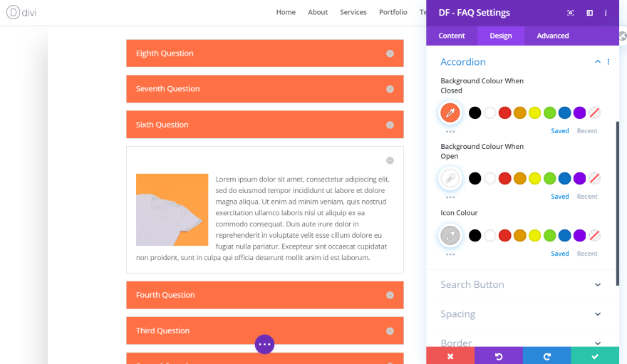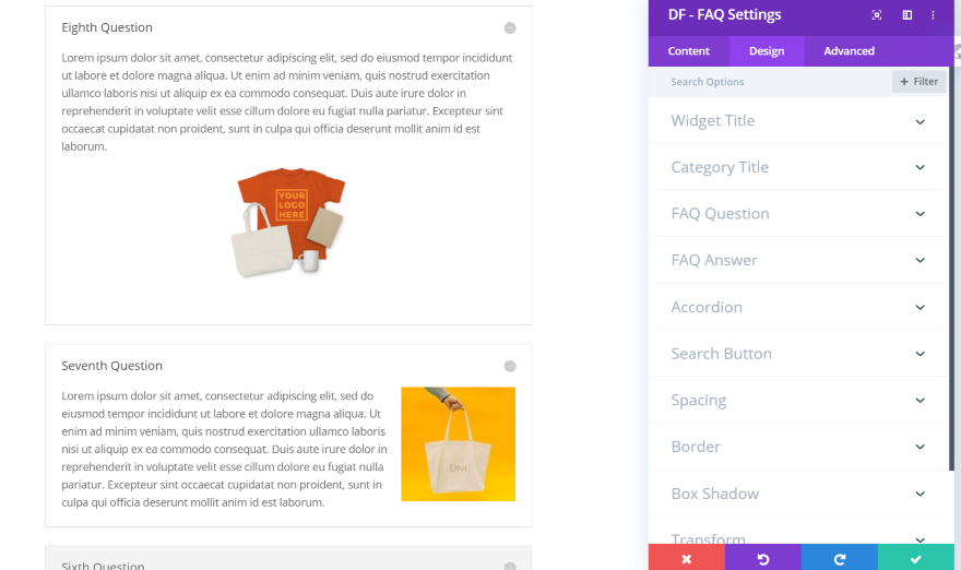 DF – 常見問題解答– 將您創建的常見問題解答顯示為單列中的一組切換。 顯示特定類別並使用熟悉的 Divi 模塊設置為其設置樣式。 您還可以按類別對它們進行分組。