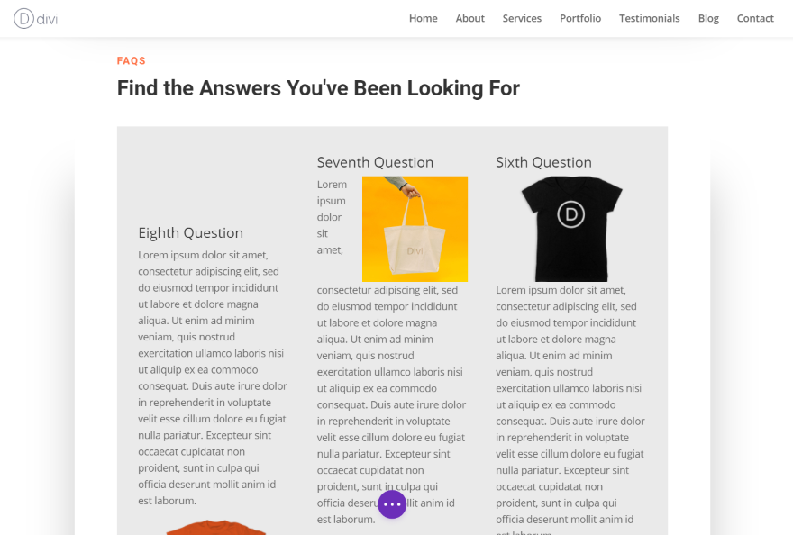 這是常規的常見問題解答模塊。 它的工作原理與 Divi 完全相同。 即使在帶有側邊欄的佈局中也不需要調整。