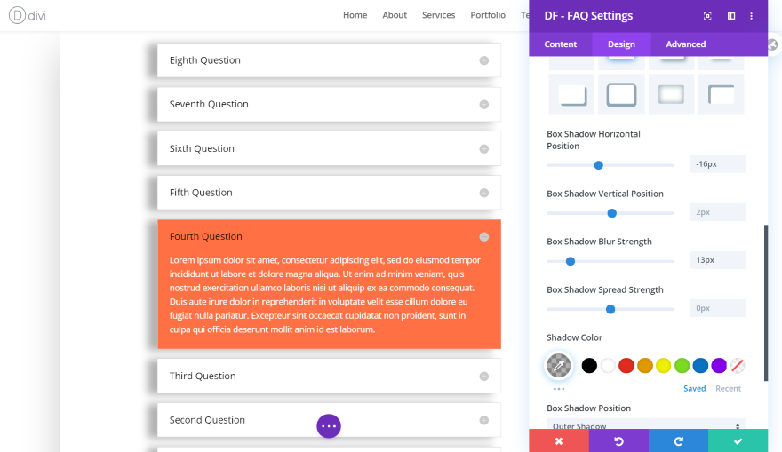對於這個,我將橙色背景放置在打開的手風琴中,並將其文本設為白色。 將顏色添加到常規背景設置也會影響該區域並優先於手風琴設置。 我將關閉的手風琴的背景設為白色,並將文本設為黑色。 我還添加了一個框陰影並調整了它的水平位置和模糊強度。