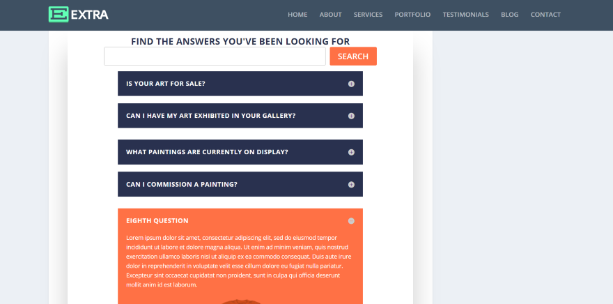 FAQ Plugin 似乎與 Extra 配合得很好。 這是帶有多列模塊的藝術畫廊佈局頁面。 此佈局使用側邊欄。 該模塊反應靈敏,可輕鬆適應狹窄區域。