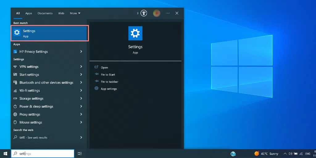 - 按 Windows 鍵 + I 開啟“設定”視窗或在搜尋列中輸入“設定”,如下所示:
