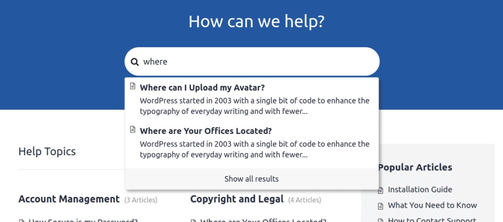 使用此解決方案,您可以為任何 WordPress 主題添加一個功能強大且完全可搜索的知識庫,使您的客戶能夠在考慮聯繫代理之前快速找到解決方案。