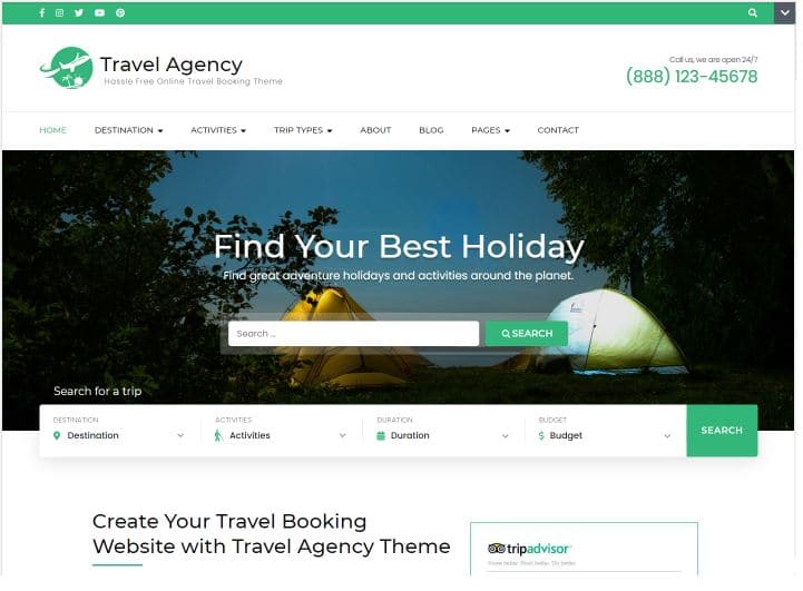 流行的 WordPress 主題是另一個很棒的免費選項,它提供了既專業又美觀的簡潔設計。 雖然它是為旅遊業量身定做的,但它也可以適用於各種業務,包括攝影、酒店、健身、水療、美容、教育、體育等。