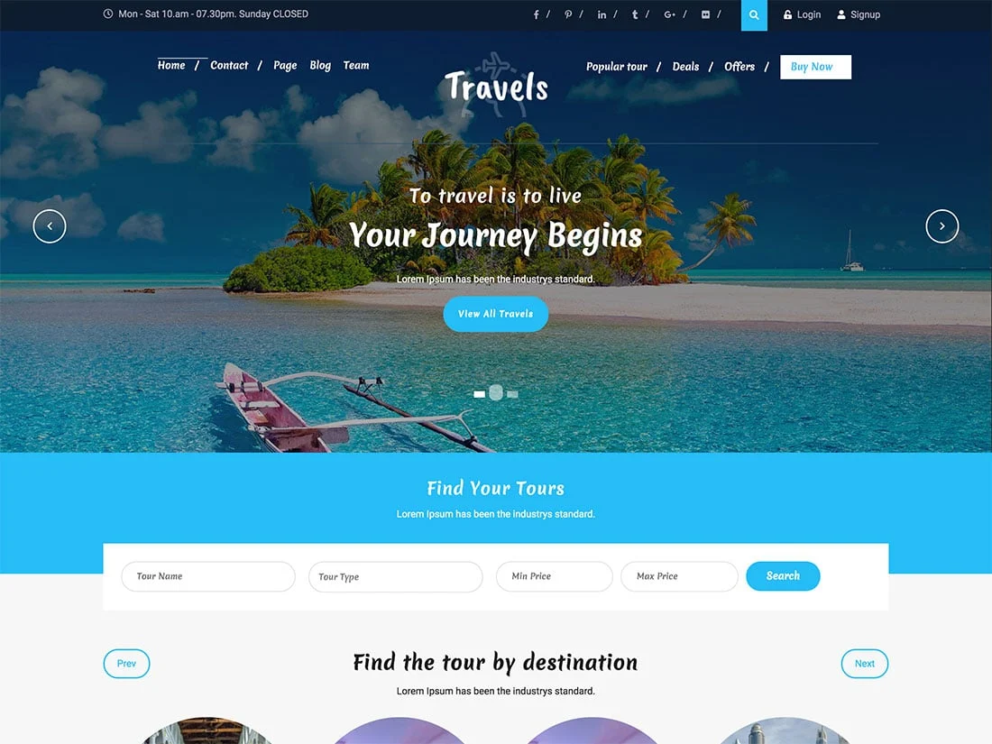 Travel Ultimate 是一個易於使用的免費主題,最適合旅行社。 該主題使您可以輕鬆地在主頁上搜索旅遊,您可以輕鬆地顯示熱門地點並將訪問者推向您的博客,以便他們可以閱讀有關各種旅遊目的地的更多信息。 除此之外,您還可以顯示過去客戶的評論,以便建立信任。