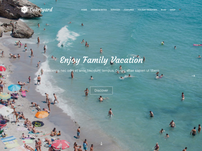 Courtyard 是另一個 WordPress 主題選項,它提供響應式和簡潔的設計,可用於多種用途。 它是為旅遊業量身定做的,可讓您展示全幅圖像,以真正幫助遊客沉浸在您希望宣傳的目的地中。