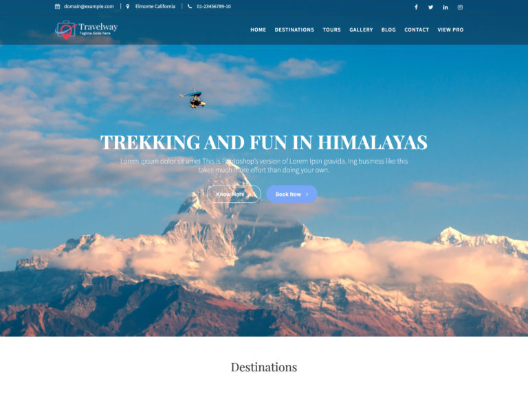 另一個很棒的選擇是 Travel Way 主題。 這個 WordPress 主題響應迅速,非常適合旅行或旅遊行業的任何公司。 但由於它的畫廊設置,它也可以很容易地用於投資組合或攝影網站。 這個主題的功能集很強大,包括多種字體可供選擇。 有了它,您可以展示與您的公司相關的服務、套餐、目的地和其他元素。