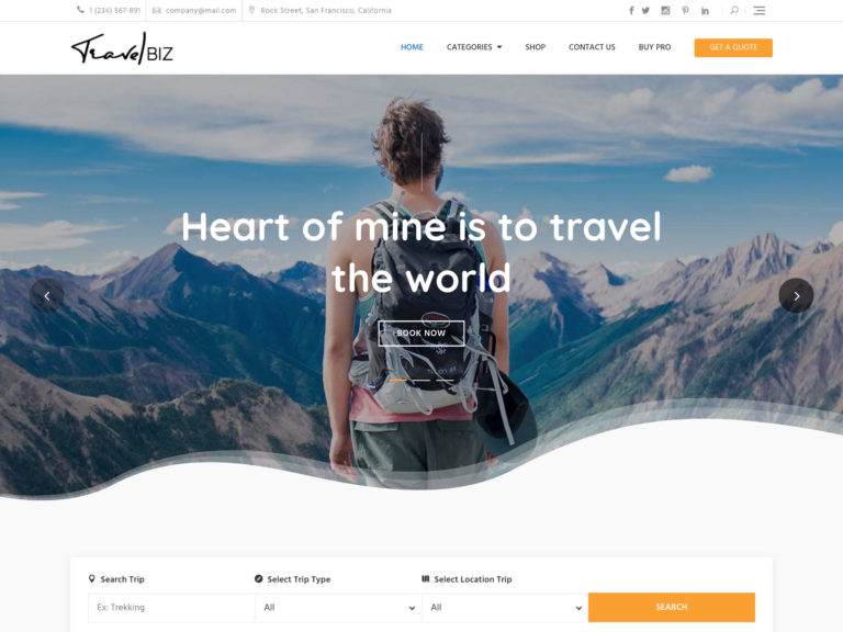 Travel Eye 是任何希望將預訂納入其博客設置的博客或代理商的完美旅行主題。 這個主題將所有聯繫信息、社交媒體鏈接以及幾乎所有內容都可以從主頁訪問的菜單放在全視圖中。 全屏滑塊為您提供了用令人驚嘆的圖片吸引觀眾所需的所有屏幕空間。