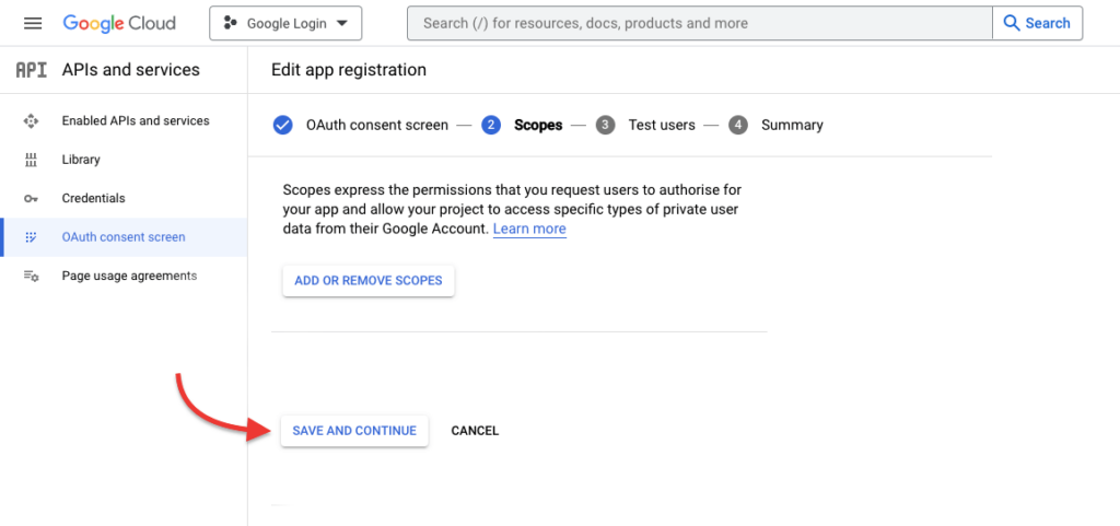 在下一個範圍部分,單擊“保存並繼續”,如下面的屏幕截圖所示。