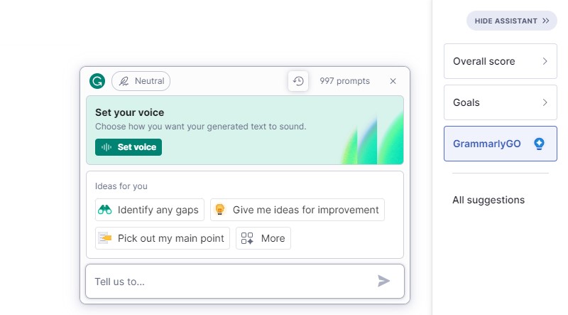 GrammarlyGO 是 Grammarly 的生成式 AI 工具,可協助您撰寫、重寫、構思和回覆文字。 它具有上下文感知能力並考慮您的個人聲音,提供尊重用戶代理和真實性的相關和個性化建議。