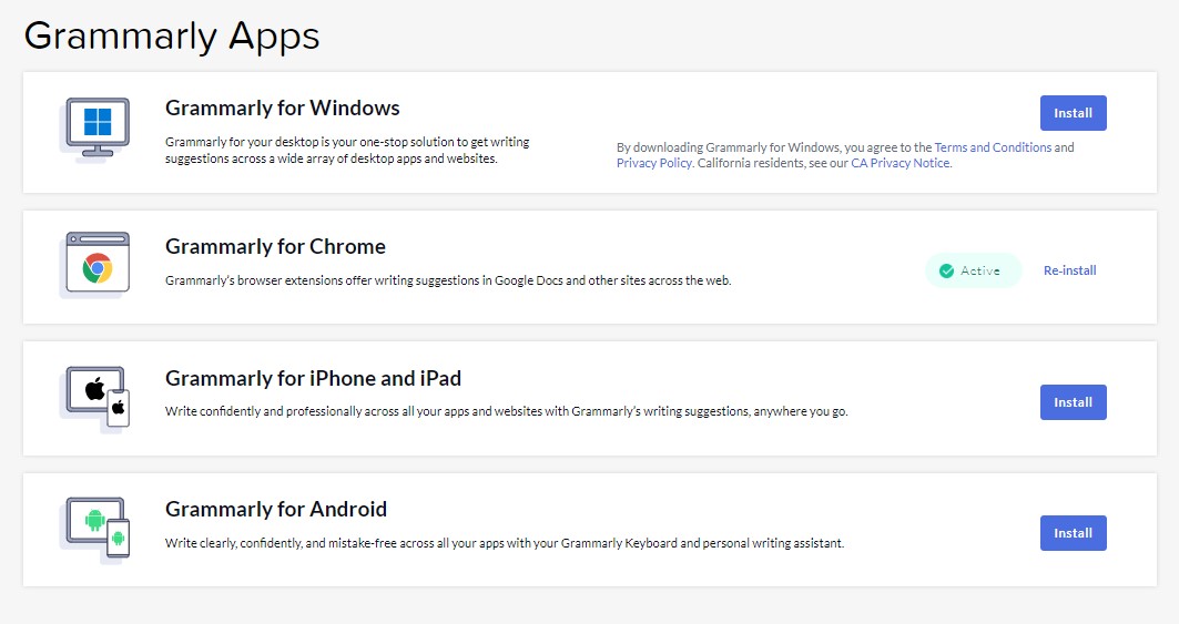 您需要訪問 Grammarly 網站並下載應用程式安裝程式。 安裝過程非常簡單。 之後,您就可以開始使用類似網頁版的工具了。