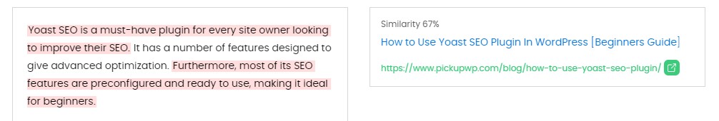 另一方面,當我們使用像 Duplichecker 這樣的免費抄襲檢查器時,它立即檢測到我們文章中的抄襲行為。