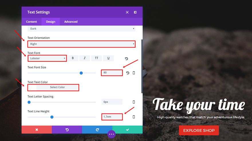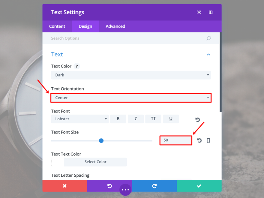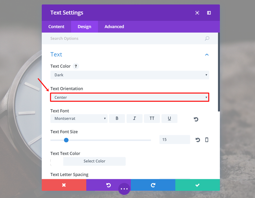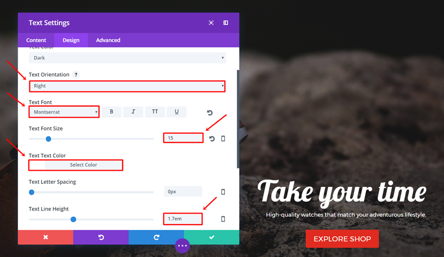 添加另一個文本模塊,在內容框中鍵入文本並轉到“設計”選項卡。 在文本子類別中,應用以下更改: