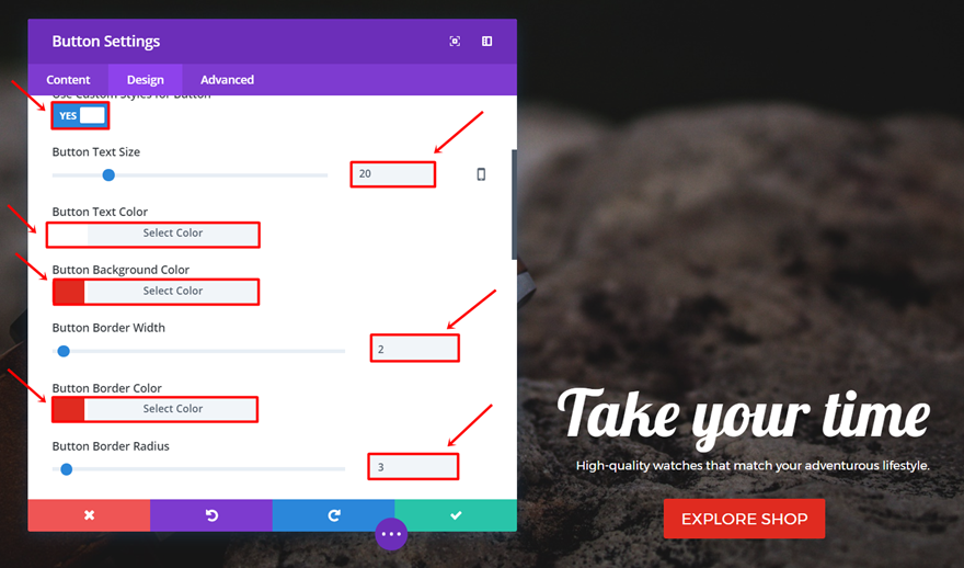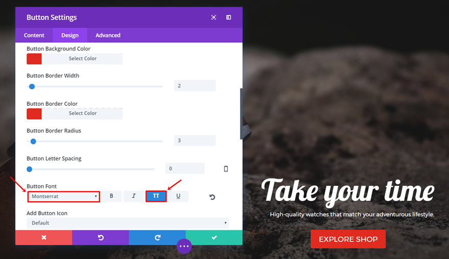 繼續添加按鈕模塊並鍵入按鈕文本。 接下來,轉到“設計”選項卡並將“按鈕對齊”更改為“右”。