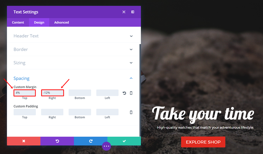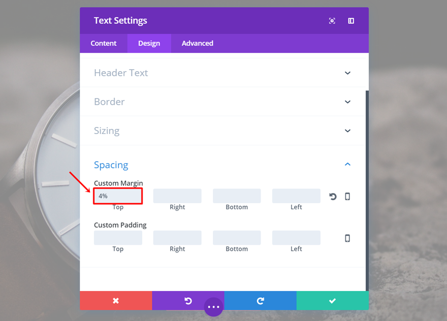 向下滾動相同的選項卡,並將“4%”添加到“間距”子類別中的“上邊距”和“-12%”到右側邊距。