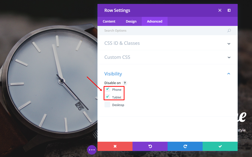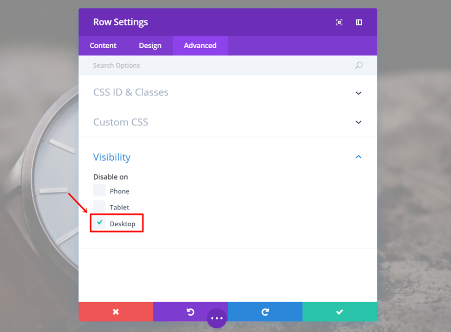 接下來,轉到“高級”選項卡並禁用“可見性”子類別中的手機和平板電腦行。