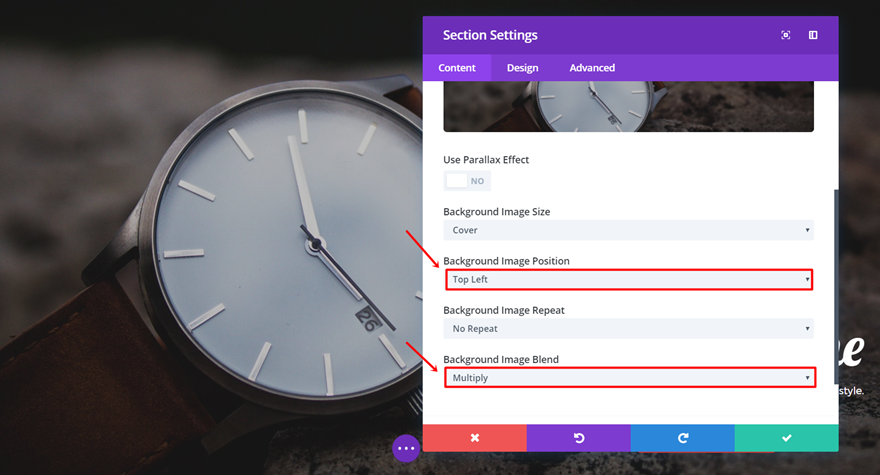 接下來,返回背景圖像並應用背景圖像混合。 在這種情況下,我們將使用“乘法”。 將背景圖像位置也更改為“左上角”。