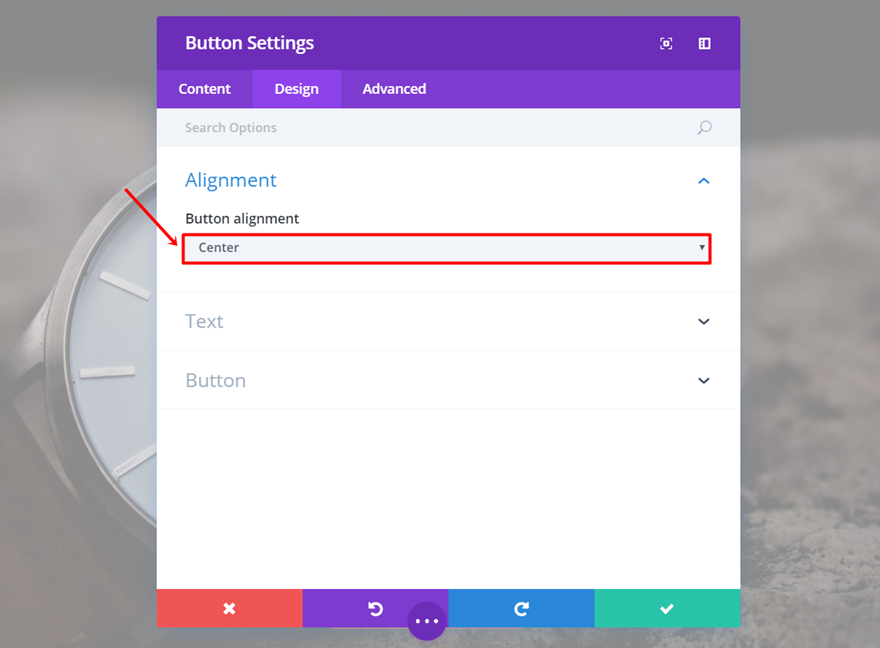 最後但並非最不重要的一點是,打開按鈕模塊並將按鈕對齊方式也更改為“居中”。