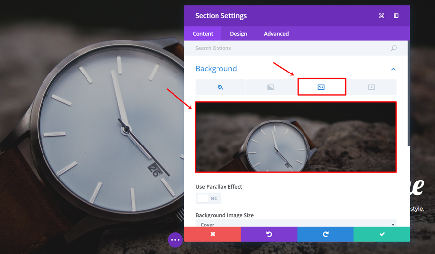 本例中使用的圖像來自 Unsplash。 選擇您想要用作背景圖像的任何圖像,然後打開您正在處理的部分的設置。 在內容選項卡中,您將找到背景子類別。 首先添加背景圖像。