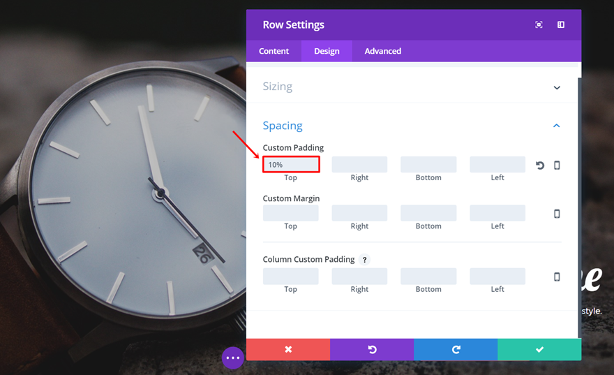 繼續,我們將向我們創建的部分添加一個全角行。 打開設置並將“10%”添加到“設計”選項卡的“間距”子類別中的頂部填充。