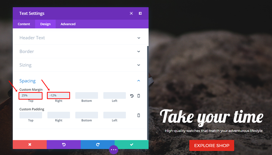 向下滾動同一選項卡,將“25%”添加到“間距”子類別中的“頂部邊距”和“-12%”到右側邊距。