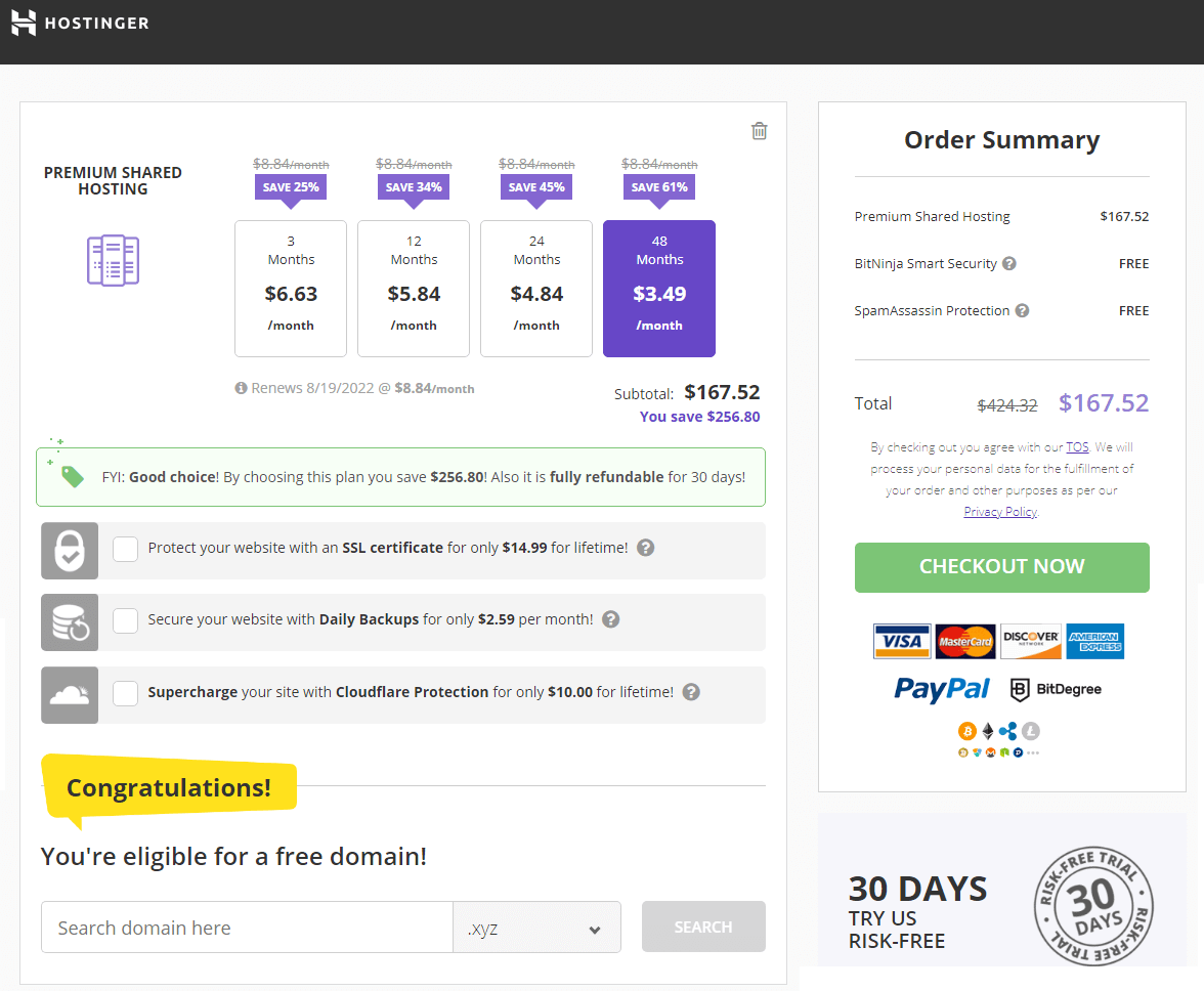 使用高級共享主機,您也有資格獲得免費域。 當您提前支付 48 美元時,您將節省 256 美元。