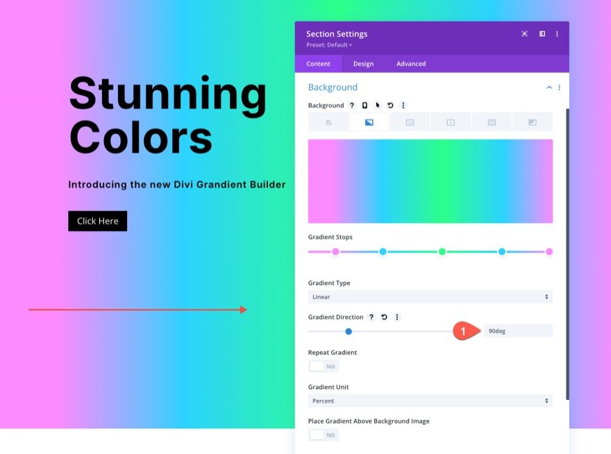接下來,我們可以為該部分添加自定義背景漸變。 對於這個漸變,我們將添加 5 個間隔相當均勻的漸變色標。 第一個和最後一個漸變停靠點將具有相同的粉紅色。 第二個和第四個漸變色標將具有相同的藍色。 第三個(中間)漸變停止將具有綠色。 這 5 種顏色將為我們的背景設計創造一個美麗的多彩漸變。