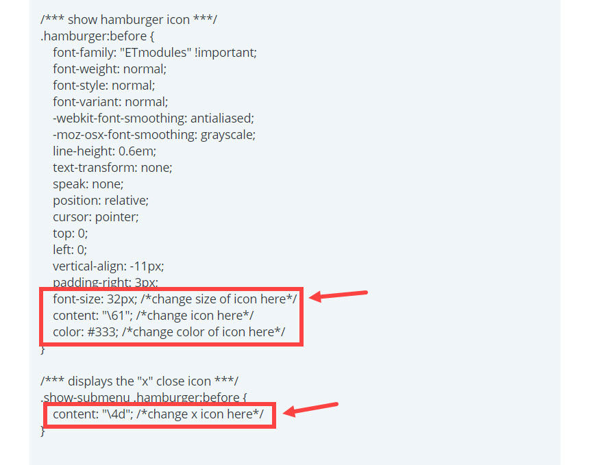Divi 帶有各種字體圖標,可用於您的網站。 如果您想將漢堡圖標更改為不同的樣式,您需要做的就是找到並編輯標有註釋“在此處更改圖標”的 CSS 行: