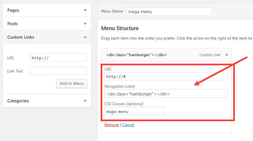 為您的圖標添加標籤很容易。 只需返回Appearance → Menus並編輯您提供給“mega-menu”類的最頂層菜單項。 在導航標籤文本框中,在 div 內添加標籤文本。 在這個例子中,我添加了標籤“菜單”。