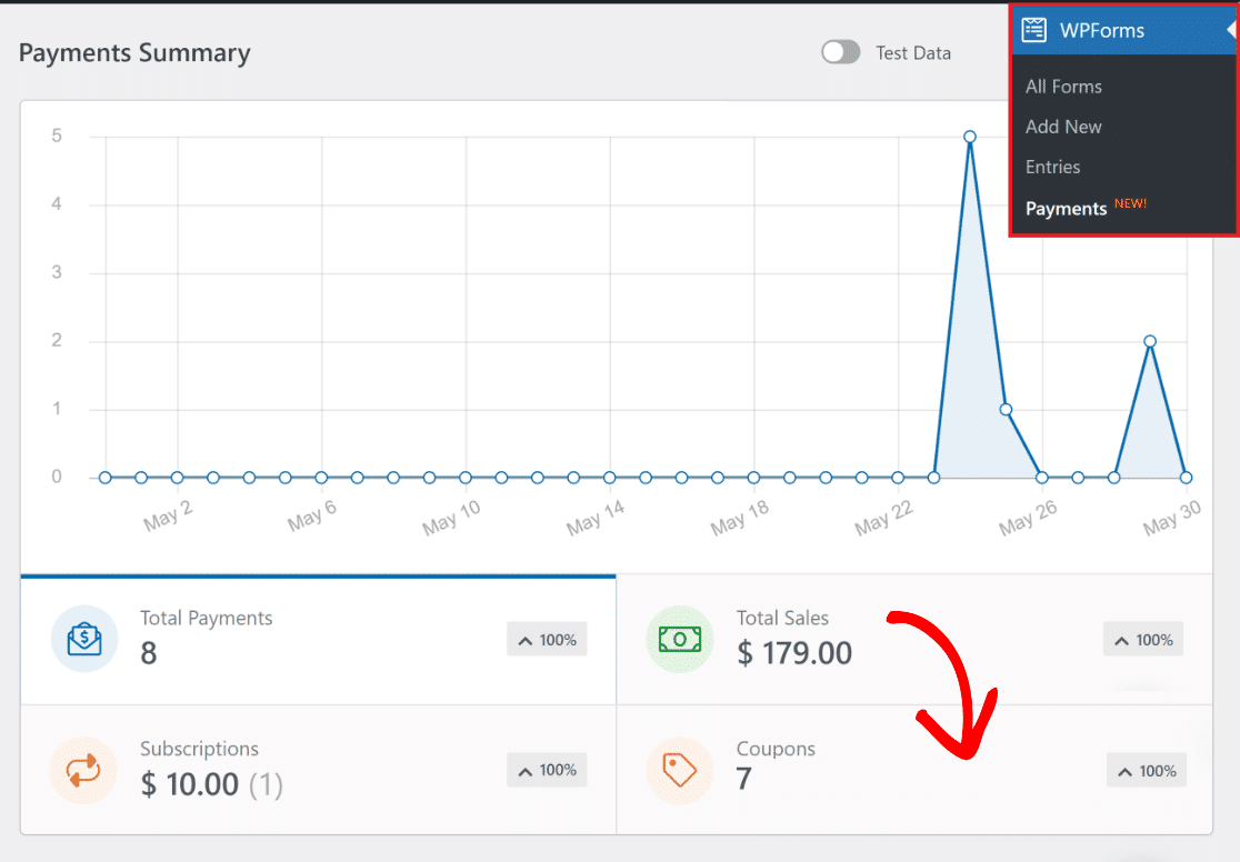 想知道用戶填寫表單後您的 WPForms 數據會發生什麼情況? WPForms Lite 和 Pro 客戶可以利用付款屏幕以有組織的方式跟踪付款和優惠券使用情況。