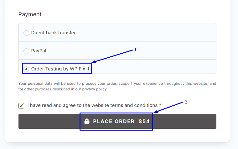 這應該在您的結帳頁面上可見。 要使用此付款方式,請訪問您的在線商店並將新產品/服務添加到您的購物車。 然後填寫您的帳單詳細信息並繼續結帳以使用“WC Order Test”插件在 WooCommerce 測試模式下結帳。