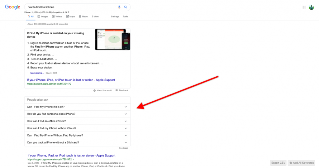 當您單擊每個單獨的選項時,將出現更多答案/選項。 而且你可以繼續下去,只要你願意。 所有建議都基於您的主要“關鍵字”,而其他問題只是人們搜索與該主要關鍵字相關的內容。