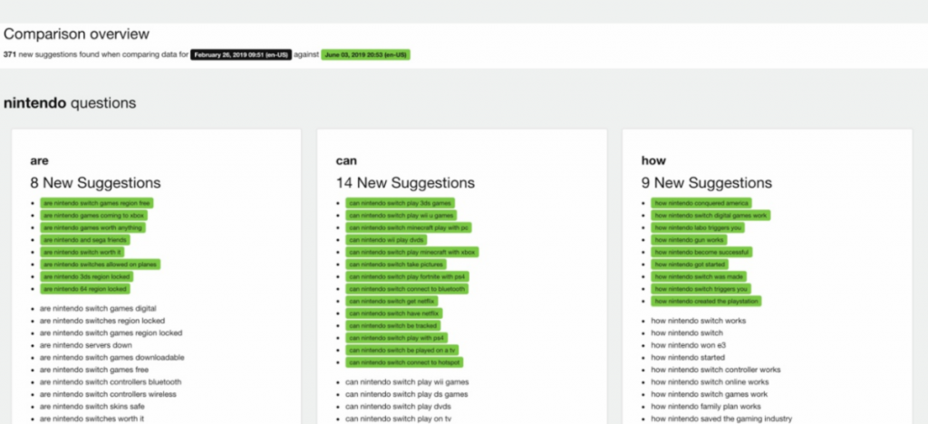 該網站旨在為您提供人們在搜索引擎上搜索的不同類型問題的概要。 它使用許多不同的介詞和形容詞為您提供完全簡潔的關鍵字以在您的內容中使用。