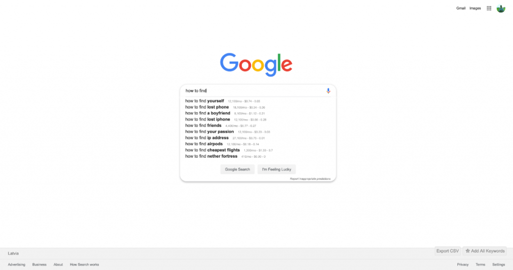 是的,您也可以使用 Google! Google 自動完成功能的美妙之處在於它會立即向您顯示最受歡迎的搜索。 因此,如果您正在考慮某個特定的關鍵字 - 為什麼不圍繞它進行一些搜索,看看 Google 的建議是什麼。