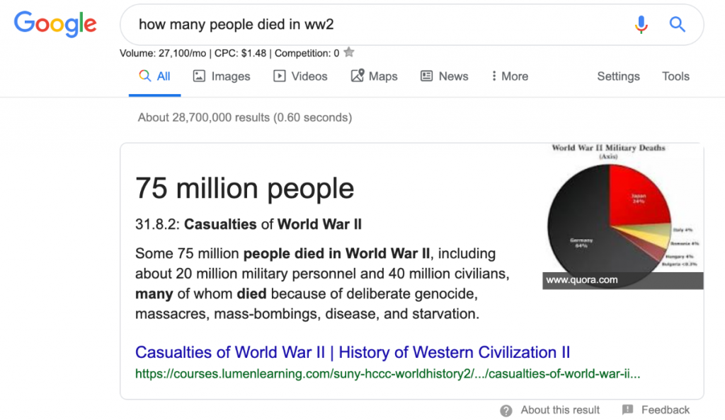 而搜索“有多少人在二戰中死亡”將展示直接基於數據的輸出。 您甚至不需要訪問該網站即可立即了解您的特定查詢量。