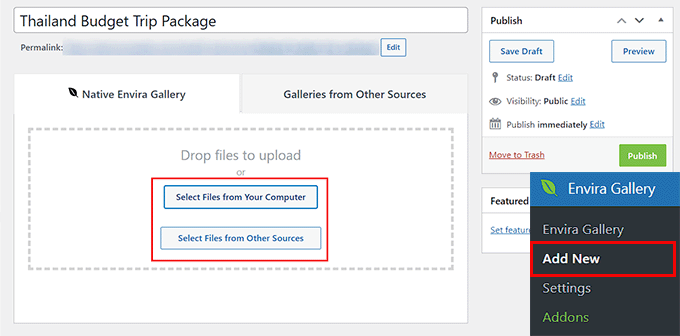 您也可以從區塊選單中拖放「Envira Gallery」區塊來新增為旅行套餐建立的圖片庫。