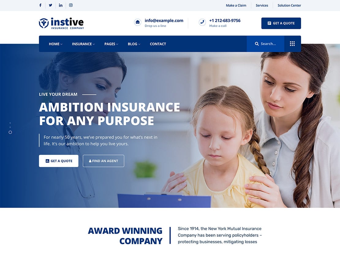 Instive 是一個具有高度專業外觀設計的保險代理 WordPress 主題。