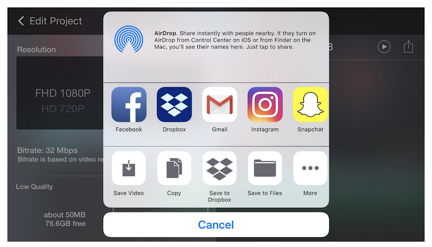 視頻準備好後,以推薦的質量導出或根據需要進行調整。 導出後,您可以通過社交媒體或通過信使或電子郵件或已鏈接到設備上的共享功能的任何其他應用程序共享它。