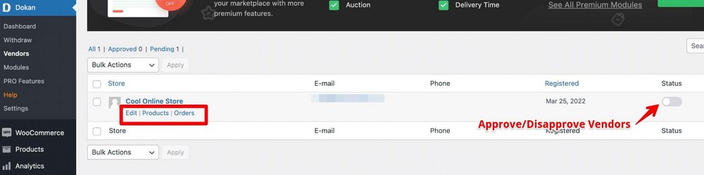 您可以通過 Dokan Dashboard 輕鬆管理您的供應商。 前往Dokan > Vendors查看供應商詳細信息。