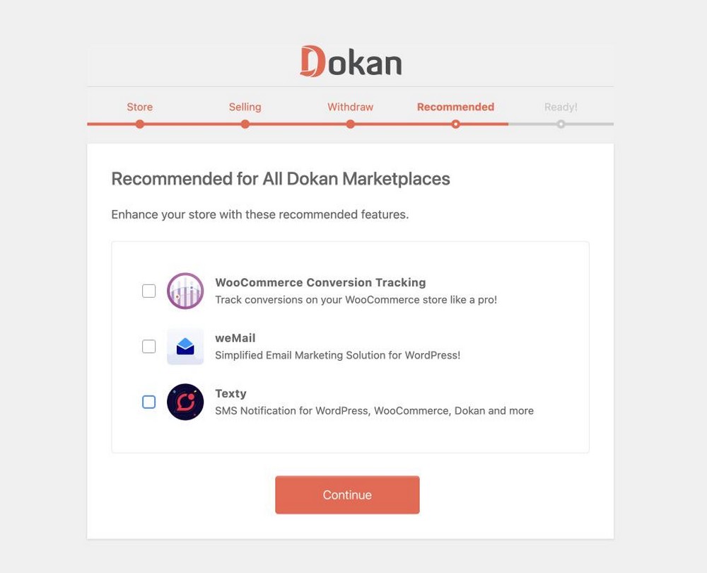 在下一步中,Dokan 建議您安裝一些插件。 在我看來,你現在不需要它們。 但是,如果需要,您可以稍後安裝此插件。