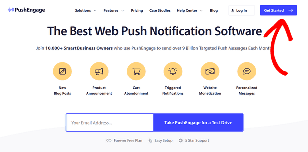 前往 PushEngage 主頁並點擊「開始」按鈕: