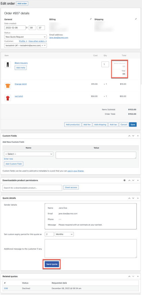 當您收到新的報價請求時,我們會通過電子郵件通知您。 要響應請求,請轉到WooCommerce >訂單並單擊相應的請求。