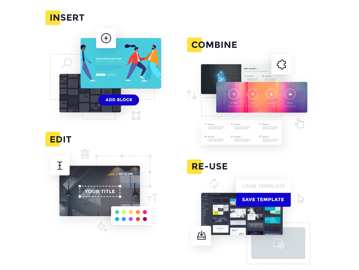 如前所述,然後您可以開始組裝這些內容塊以快速創建您自己的頁面設計。 通過組合不同的塊,您可以輕鬆地組合獨特的頁面,並根據您的特定需求量身定制。