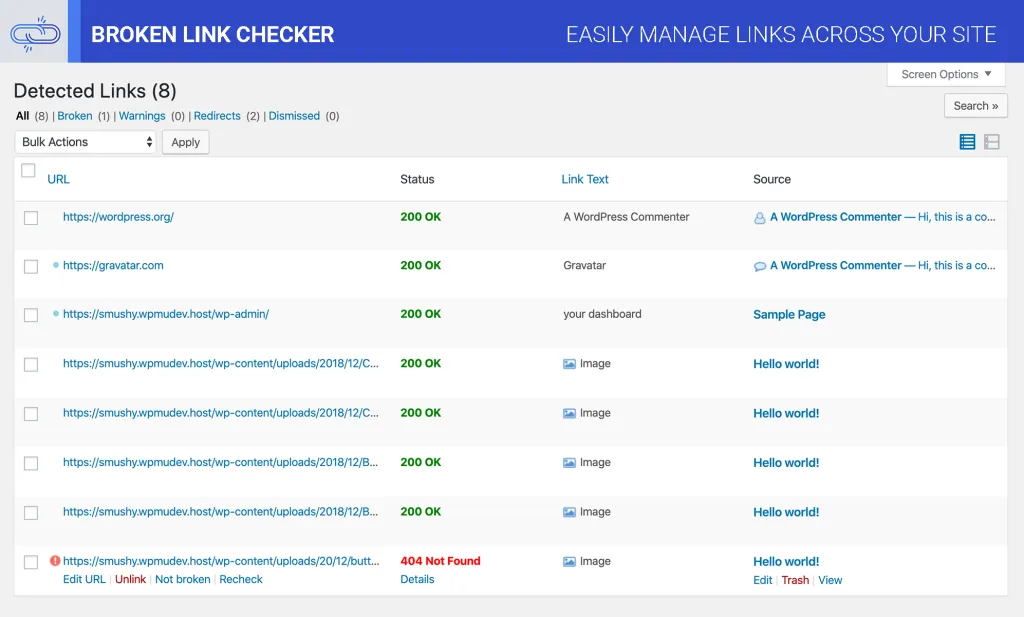 Broken Link Checker 是最好的 SEO 插件之一,它可以幫助和測試您網站上的所有內部鏈接和外部鏈接,以查找損壞的鏈接。 它修復了不良鏈接並有助於改善 SEO。 它檢測斷開的鏈接和丟失的圖像。 借助此插件,您可以直接從插件頁面編輯鏈接,而無需手動更新每個帖子。
