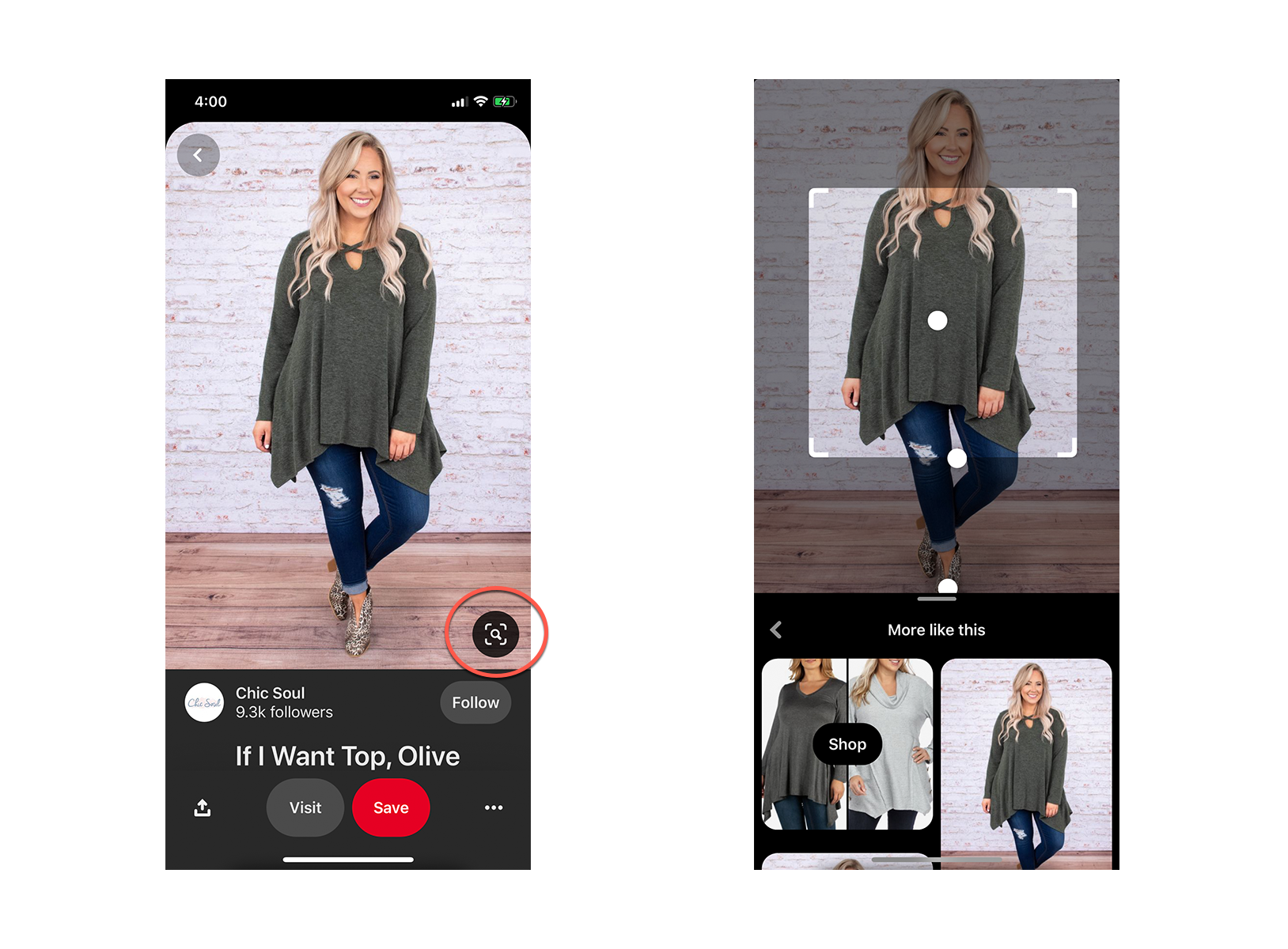 Pinterest 鏡頭使用簡單。 如果您想搜索與您保存的圖釘相似的產品,只需單擊圖釘,然後單擊圖像右下角的放大鏡圖標。 然後,您將獲得選擇要搜索的特定項目的選項。