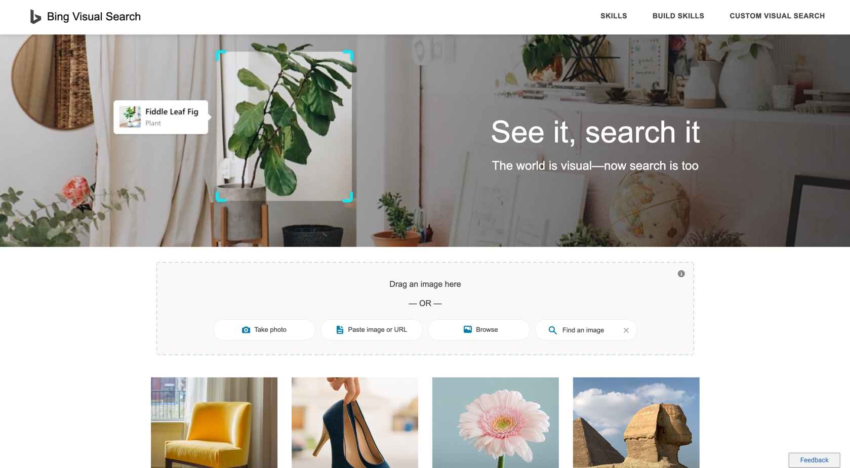Bing Visual Search 是一種基於瀏覽器的工具,允許用戶直接在站點上搜索或拖放圖像。 界面簡單易用。 用戶可以搜索: